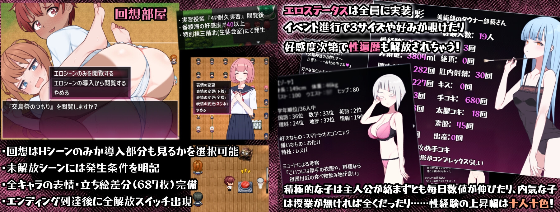 内向的で授業以外では数値が伸びない子の様子など、ヒロインによって上昇幅の異なる性経験を日々楽しむことができます。